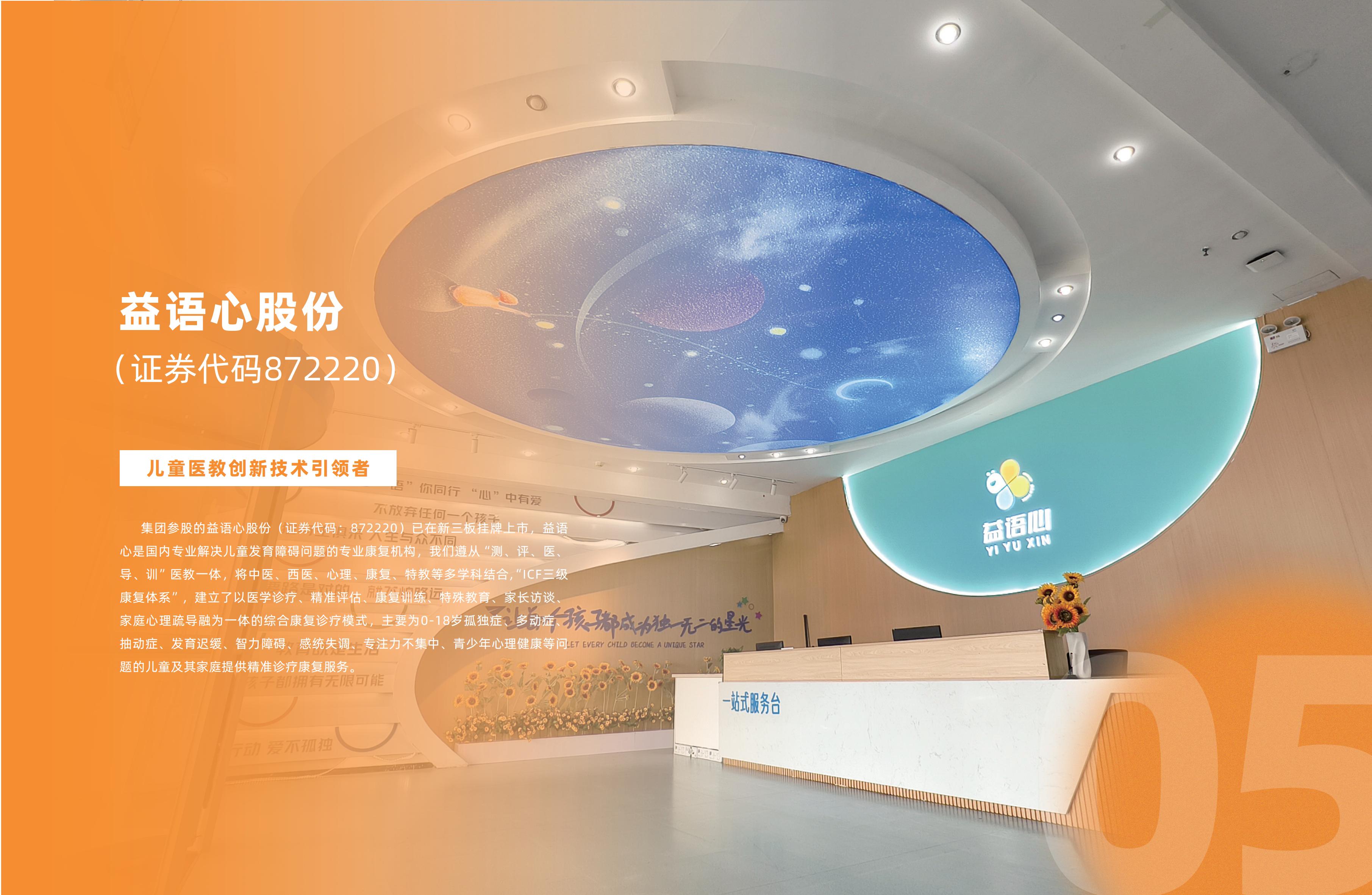 J9旗舰厅控股集團(tuán)有限公(簡(jiǎn)chēng“J9旗舰厅控股集團(tuán)tuán”)始建2017nián11yuè,集團(tuán)總部位于山東泰ān,總建筑面積七萬余píng,現(xiàn)有員gōng700余rén,是一家集醫(yī)kāng養(yǎng)yǎng產(chǎn)chǎn學(xué)xué、研于一體的綜合性健康產(chǎn)業(yè)集團(tuán)公。集團(tuán)下設(shè)成kāng、醫(yī)康養(yǎng)yǎng、醫(yī)療科、教育等事業(yè),通guò“立足本、放眼全qiú”的戰(zhàn)略布,構(gòu)建起多維度的心理康復(fù)服務(wù)體。 集團(tuán)參股的益語心股fèn(證券代:872220)已在新三板掛牌上shì,益語心是國(guó)內(nèi)專業(yè)解決兒童發(fā)育障礙問題的專業(yè)康復(fù)機(jī)構(gòu)gòu,我們遵cóng測(cè)評(píng)píng醫(yī)導(dǎo)dǎo訓(xùn)xùn”醫(yī)教一,將中醫(yī)、西醫(yī)、心、康復(fù)、特教等多學(xué)科結(jié),“ICF三級(jí)康復(fù)體”,建立了以醫(yī)學(xué)診liáo、精準(zhǔn)評(píng)、康復(fù)訓(xùn)liàn、特殊教、家長(zhǎng)訪tán、家庭心理疏導(dǎo)融為一體的綜合康復(fù)診療模shì,主要wèi0-18歲孤獨(dú)zhèng、多動(dòng)zhèng、抽動(dòng)zhèng、發(fā)育遲huǎn、智力障ài、感統(tǒng)失調(diào)diào、專注力不集zhōng、青少年心理健康等問題的兒童及其家庭提供精準(zhǔn)診療康復(fù)服務(wù)。目前業(yè)務(wù)已經(jīng)拓展到浙jiāng、江、廣東等